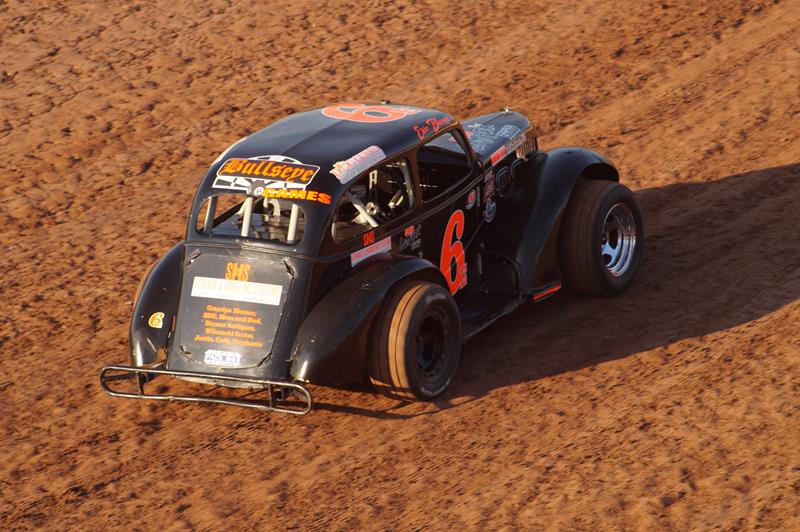 The action heated up on the second lap of the feature with one car spinning in the second turn. Two or three cars ping-ponged off him and Eric had nowhere to go and nipped one of the other spun cars. The immediate result was a bent bumper and flat tire on the 6E.